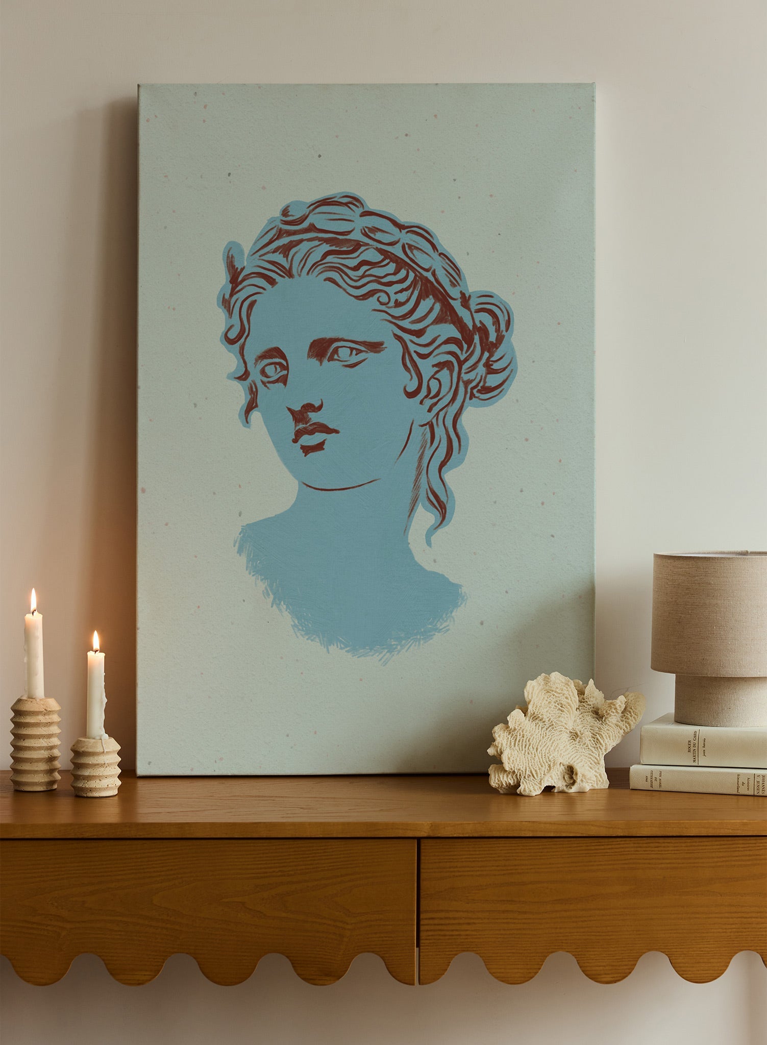 The beauty of this piece lies in its bold, two-tone composition. The use of a cool blue for the bust itself is an inventive choice that feels fresh and original, while the earthy red linework provides warmth and intricate detail. This colour story creates a dynamic visual tension that is both sophisticated and highly stylish, making it a memorable focal point in any room.