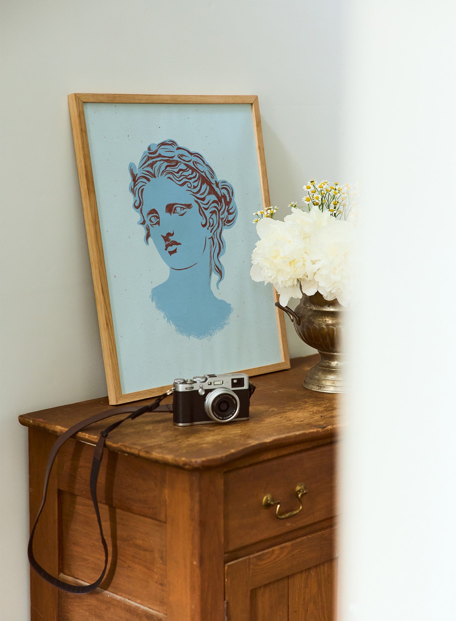 This striking art print offers a contemporary, graphic interpretation of a classical bust. The subject, likely a goddess or noblewoman from antiquity, is rendered in a serene light blue, creating a cool, sculptural effect. Her intricate hairstyle and dignified features are drawn with fine, contrasting lines in a warm, terracotta red. This unexpected and modern colour pairing breathes new life into the classical form.