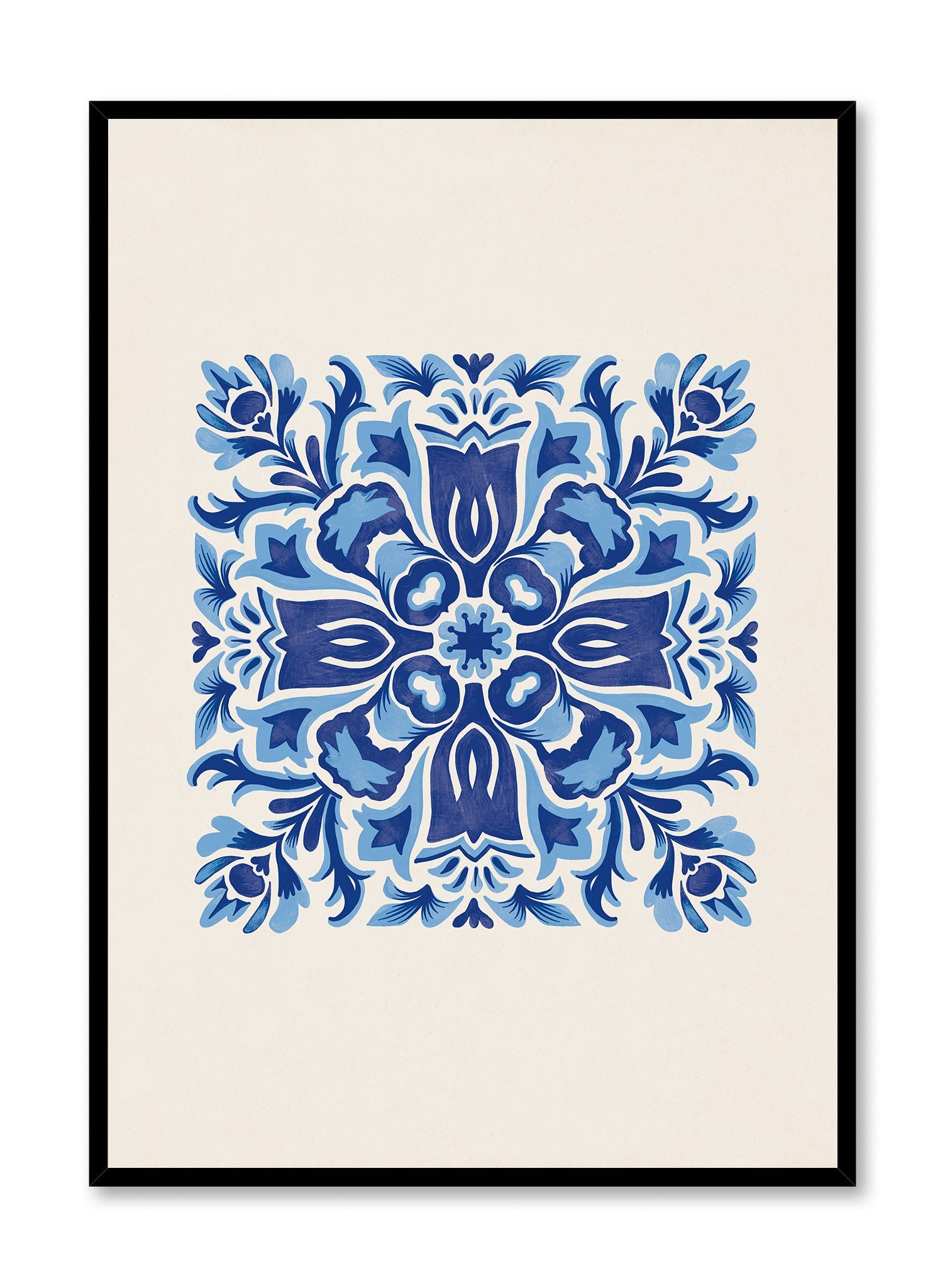 This art print beautifully depicts a single, ornate Mediterranean tile, rich with intricate detail. The symmetrical design features swirling, floral-inspired motifs that blossom from a central point, showcasing the masterful craftsmanship of traditional European tilework. Inspired by classic Portuguese Azulejos or Italian Majolica, this piece is a celebration of pattern, precision, and the decorative arts, bringing a touch of history and artistry into the home.