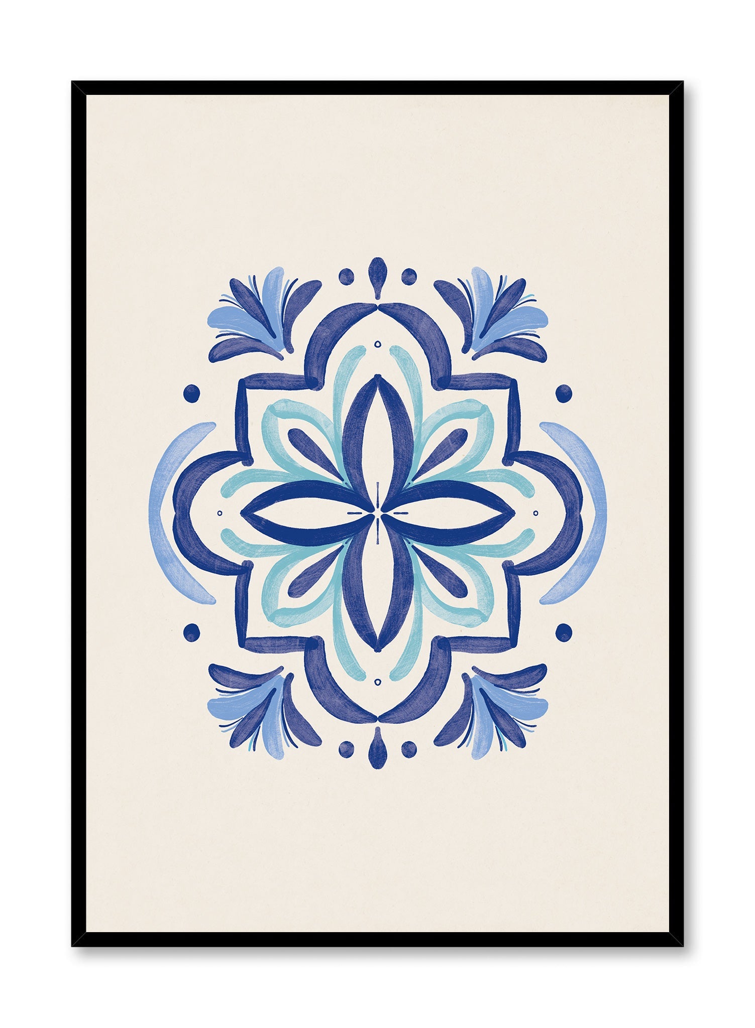 This artwork centers on a beautifully symmetric motif reminiscent of classic Mediterranean tilework. The elegant, floral-like pattern unfolds from the middle, with graceful curves and botanical shapes rendered in lovely shades of blue. Its balanced and harmonious composition creates a sense of calm and order, evoking the detailed craftsmanship of hand-painted ceramics found in a sun-lit Italian villa.